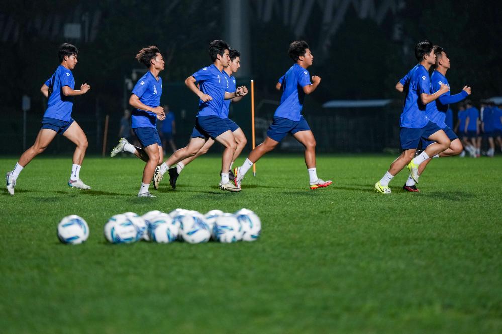 ↑6月9日,南京队主教练何塞(后排左一)在指导球员训练。