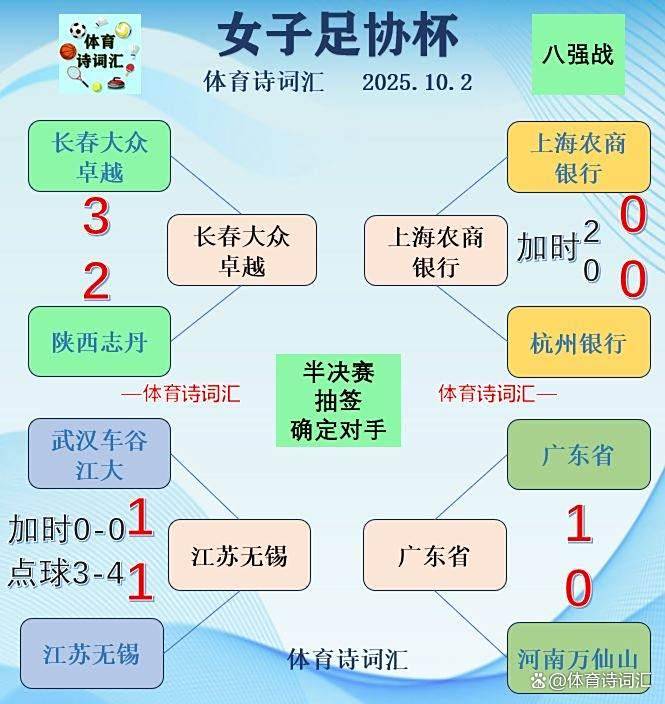 至此,2025年女子足协杯的四强名单正式出炉,她们分别是广东、长春、上海和江苏。接下来的半决赛对阵将通过重新抽签决定,比赛时间另行通知。值得一提的是,作为新科亚冠冠军的武汉女足,也将在10月8日,踏上世俱杯(冠军杯)的赛场,继续为荣誉而战。