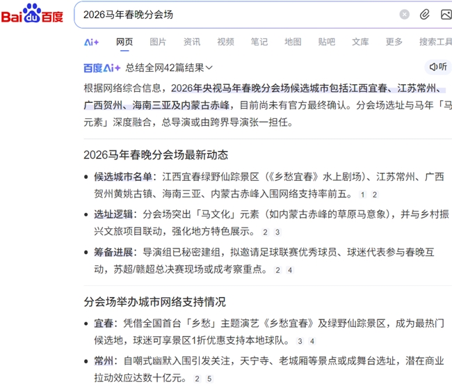 据悉,2026马年春晚总导演张一一亲临“苏超”“赣超”总决赛现场观摩比赛,优秀球员、球迷代表将邀请登上2026央视马年春晚舞台和观众席。另外,日前已秘密建组的2026总台春晚导演组正在全国各地甄选马年春晚分会场,从目前的网络民意支持率来看,江西宜春、江苏常州、广西贺州、海南三亚、内蒙古赤峰的网络民意支持率领先,你期待哪个城市入选春晚分会场呢?