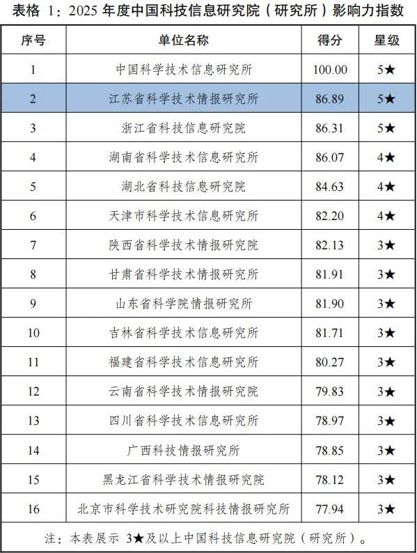 近日,《数智时代中国图书馆影响力指数报告(2025版)》发布。在其中的“中国科技信息研究院(研究所)类影响力指数”排名中,江苏省科学技术情报研究所位居全国第二,仅次于中国科学技术信息研究所。(交汇点新闻)