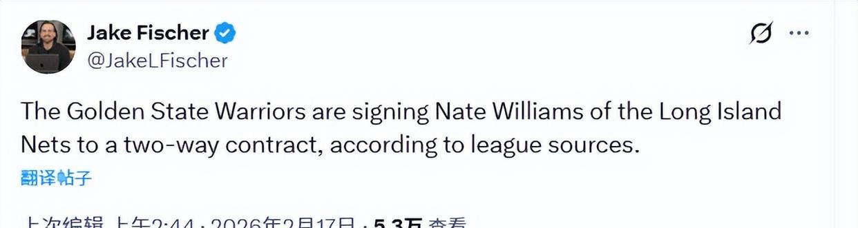 江苏超级足球联赛,江苏足协联赛,足球赛程,积分榜,江苏球队,足球直播,聚焦江苏超级足球联赛,提供2025年赛程、积分榜、参赛队伍资料、赛事直播及精华集锦,全民足球激情不断更新!北京时间2026年2月17日,据知名NBA记者Fischer报道,金州勇士队正式与得分后卫内特·威廉姆斯签下了一份双向合同。这位身高1米96的球员,也常被称作吉纳森·威廉姆斯,过去主要在NBA发展联盟长岛篮网队效力,寻求回归NBA的机会。