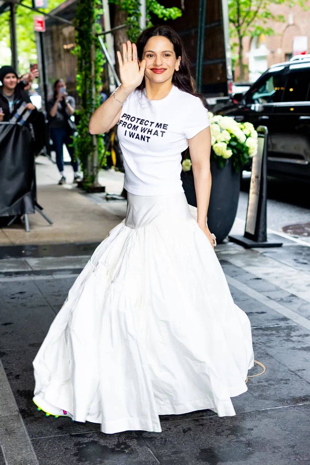 在场的所有人都注目,他们想不明白为什么 Rosalía 会混搭一双带钉足球鞋。
