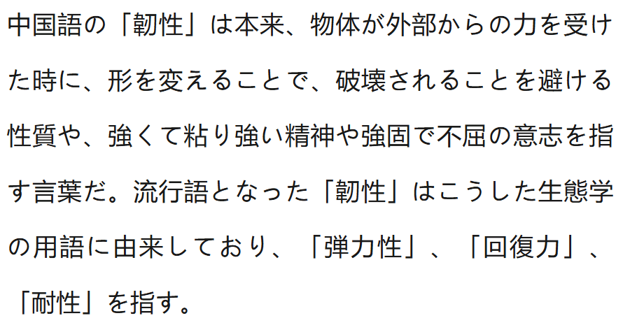 “韧性”本来指物体受外力作用时,通过形变避免被破坏的性质,也指顽强持久的精神或坚韧不屈德意志。此次流行的“韧性”则源于生态学术语,指的是“弹性”“恢复力”“耐性”。