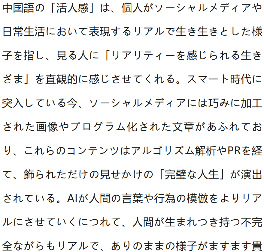 “活人感”指的是人在社交媒体或日常生活中表现出的真实、鲜活的状态,让人直观感受到“真实活着的状态”。进入智能时代后,社交平台上满是精修照片和程序化的文章,这些内容经过算法解析和宣传,呈现出被精心修饰出来的“完美人生”。随着AI对人的言行模仿越来越逼真,人与生俱来的不完美却真实、生动的状态显得愈发可贵。越来越多的人追求“活人感”,其实是对“真实自我”和“淳朴生活状态”的渴望。