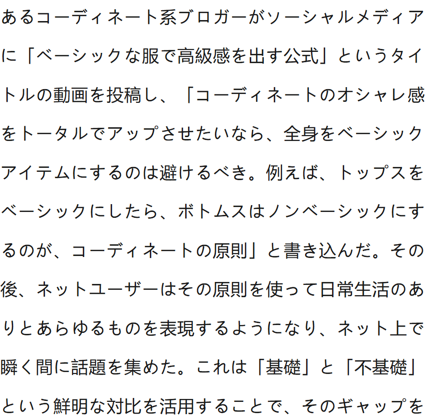 一位穿搭博主在社交媒体中发布了一条名为“基础款如何穿出高级感”的视频,文案写道:“想要穿出时尚感,就要避免上下都穿基础款。比如,上身基础,下身就不基础,这就是穿搭的原则”。之后,网友将这一原则套用到了日常生活的方方面面,迅速引发热议。运用“基础”和“不基础”的鲜明对比,诙谐表达出反差感,用于调侃式的夸人夸事夸物,或幽默自嘲。