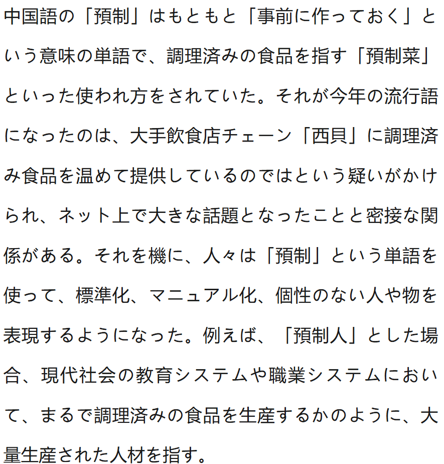 “预制”本指“提前制作”,起初多用“预制菜”来指代提前制作好的食物。今年“预制”成为流行语,和国内知名连锁餐厅“西贝”被质疑加热预制菜售卖一事在网上引发热议密切相关。在这之后,大家开始用“预制”指代那些标准化、程式化、没有个性的人或物。比如“预制人”指的就是在现代社会的教育和职业体系下,像生产预制食品一样批量培养出来的人才。